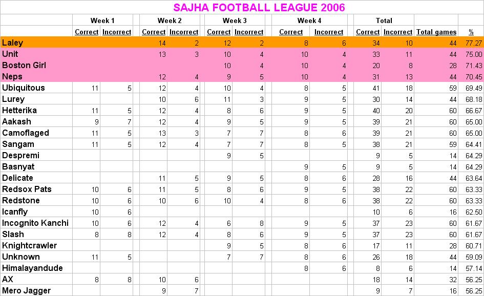 Here is the result after week 4. Laley is the overall champion. :D:D:D This week we had 3 champoins - Unit, Boston girl, and Neps. Good job guys.. good luck for next week.