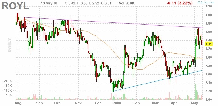 Latoboy, not sure what's happeing with ROYL but it is very thily traded and the volatility is expected. It sucks when other companies in the industry are making new highs and this is going nowhere. I will take my losses if it closes below $3.