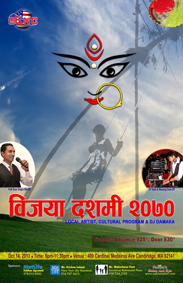 The Greater Boston Nepali Community (GBNC) welcomes each and every one to celebrate Bijaya Dashami 2013 on Monday October 14, 2013 at 400 Cardinal Medeiros Ave, Cambridge, MA 02141.