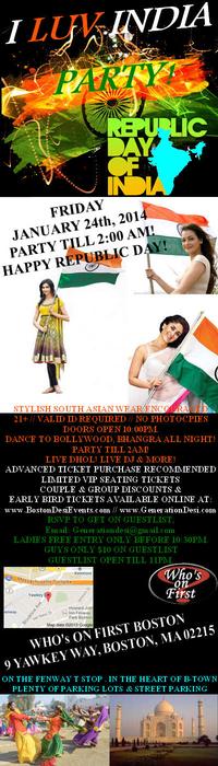 I Luv India - India Republic Day Party. ON JANUARY 24th 2014 We invite you to celebrate India's Republic day while we present the I LUV INDIA - INDIA REPUBLIC DAY DESI PARTY INDIA REPUBLIC DAY DESI Theme Party! Mark the Date! In 2014 we bring you a more exciting Bigger and Better Version & possibly the biggest Republic Day party in New England. Party at a 400 capacity until 2AM. Make sure to bring your dancing shoes while Bhangra & Bollywood running through your mind. We will party till Boston let us!! Mark the Date: Friday Jan 24th 2014. Time: 10:00 PM - 2:00 AM Where: Who's on First (Downtown Boston) 19 Yawkey Way Boston MA Right in The Fenway. Easy access of all major trains and easy parking. Plently of Free Parking in the Area & validated parking lots with $6 parking. 21 to enter. Ladies free before 10:30 PM with RSVP $10 after. Gentlemen $10 on the Guest list until 11PM by sending email to Generationdesi or visit http://www.Generationdesi.com for your advance $10 tickets until Midnight. Advanced tickets highly recommended from http://www.Generationdesi.com Jai Ho!! Jai Hind!!