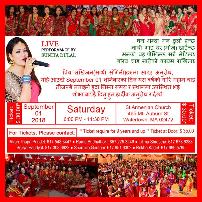 We would like to invite all Didi Baini and Aama, Hajur aama to join us for Teej celebration 2018 with Boston women’s group. LIVE performance with our very talented, sweet and lovely singer Sunita Dulal. Let’s all dive into TEEJ FEVER!!!